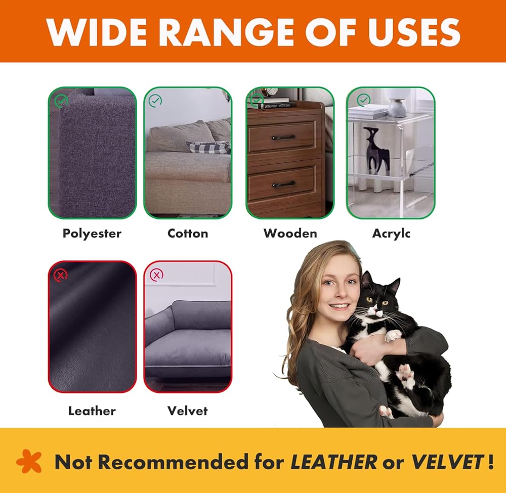 Transparent Design for Couch Protector: Our transparent sticky tape will not affect your furniture's original look and training your pet to stop scratching your sofa. Not recommended for use on faux, velvet or real leather.