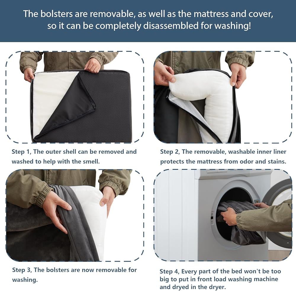 The inside cushion is in its own waterproof slip cover that comes off for cleaning and the top cover comes off for washing a game-changer for us dog parents who want to maintain a clean and fresh environment