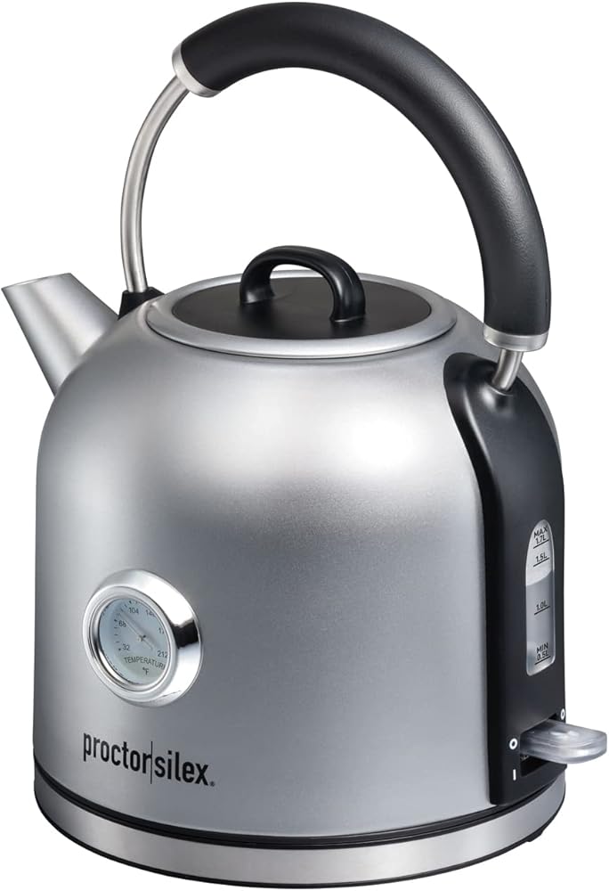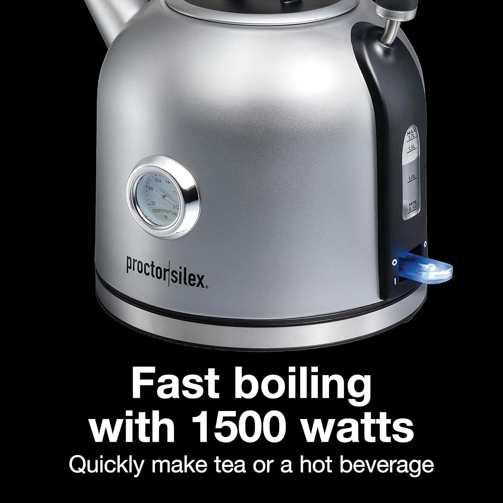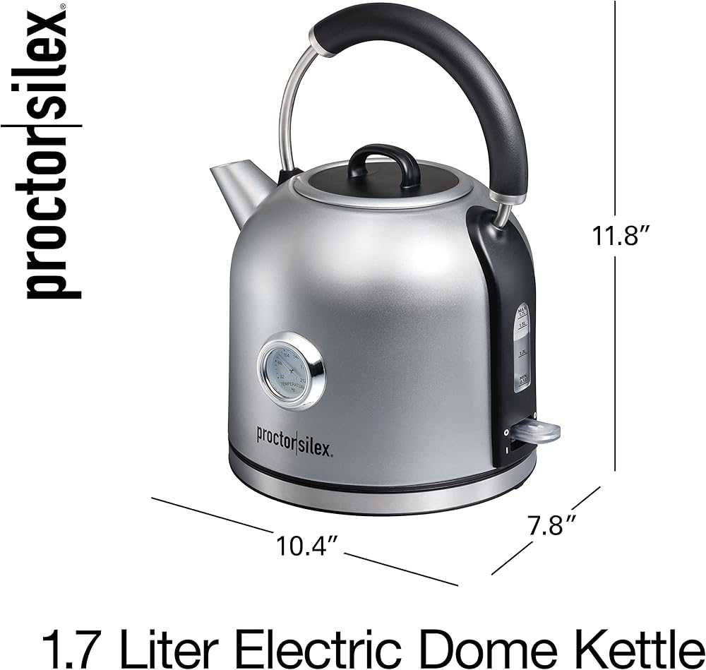 The Proctor Silex 1.7 Liter Electric Dome Kettle has fast boiling with 1500 watts and automatic shutoff. The easy-to-view temperature gauge makes it easy for you to monitor the water's temperature until it is perfect for your tea or beverage.