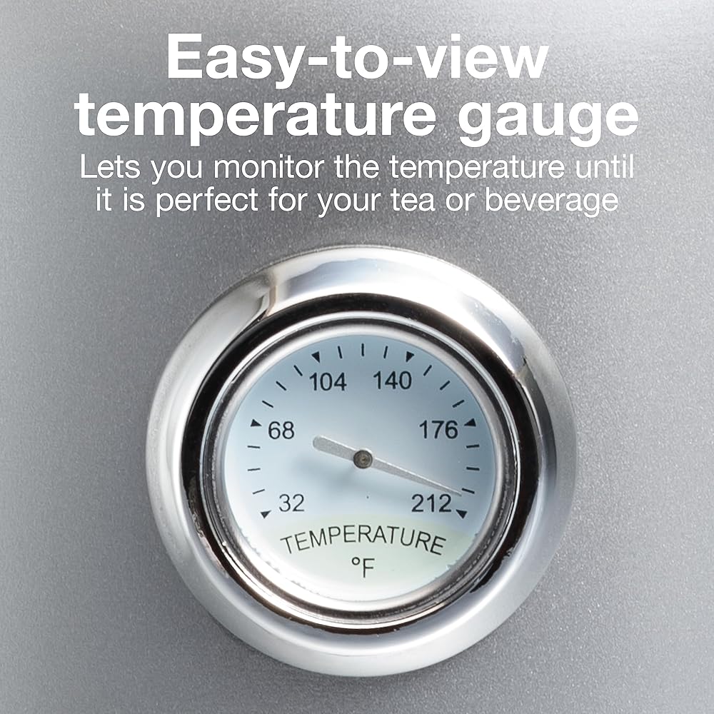 EASY-TO-VIEW TEMPERATURE GAUGE: The large 32° to 212° F temperature gauge on the stainless steel electric tea kettle makes it easy for you to monitor the water's temperature until it is perfect for your tea or beverage.