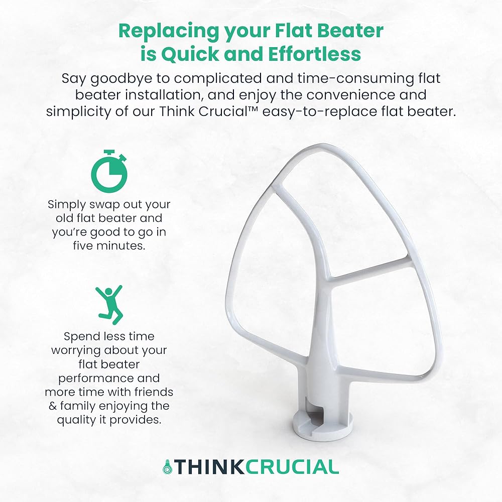 SIMPLE AND EASY TO INSTALL: Switch out in less than a minute, providing time efficiency. Get back to daily activity quickly and make a big difference with other cooking or baking ingredients and dishes in the process. Simply remove the older part and replace. It fits well with KitchenAid. Pair with a basic tool kit for a new flat replacement with ease. Simply pinch, grip, twist and remove the old flat beater.