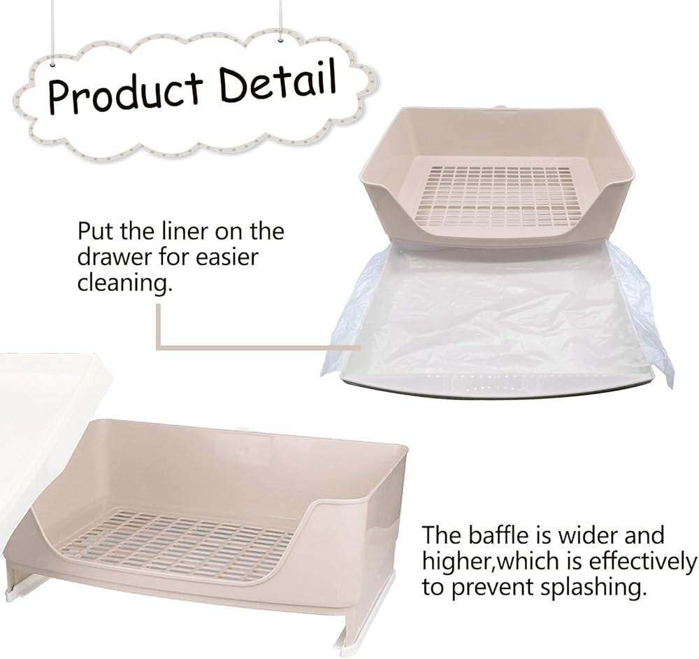 Product Features:The litter box has a low-entry design,pet can easy to get inside and use.And the baffle of toilet box is raised to effectively prevent splashing,reduce clean work.It has large mesh and you don't have to worry about your pet's feet getting stuck.With the removable drawer,you will easily to clean the toilet trash and replacing the pads.