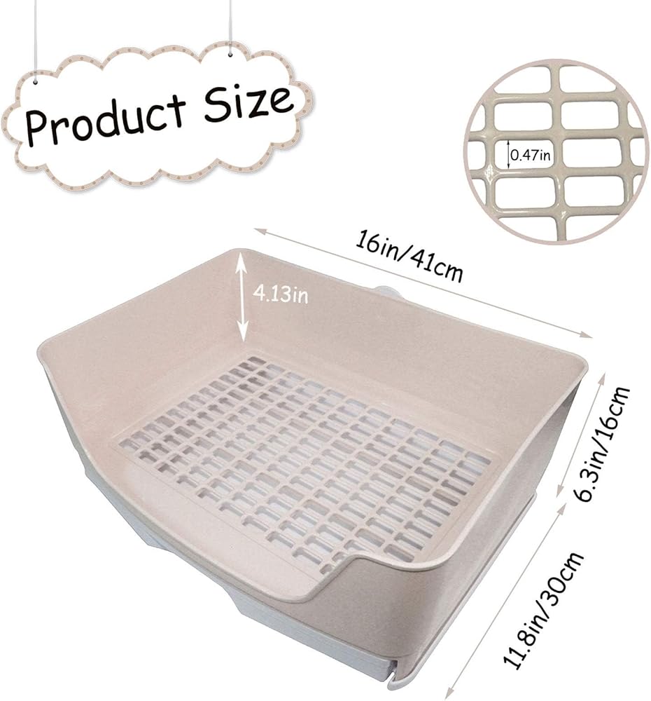 Size:Rabbit litter box size is approximately 16 x 11.8 x 6.3inches/41 x 30 x 16 cm.It has extra-large space and provide a more comfortable environment for your pet.Great for large rabbit,chinchilla,hamster,bunny,rat,guinea pig and other large animal.Please confirm if the product size is suitable for your pet cage before purchase.