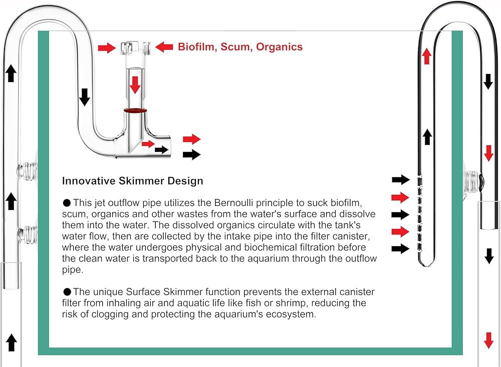 Innovative Lily Pipe Jet Outflow with Surface Skimmer Design: The unique Surface Skimmer function prevents the external canister filter from inhaling air and aquatic life like fish or shrimp, reducing the risk of clogging and protecting the aquarium's ecosystem. The jet outflow pipe creates a relatively strong water flow.