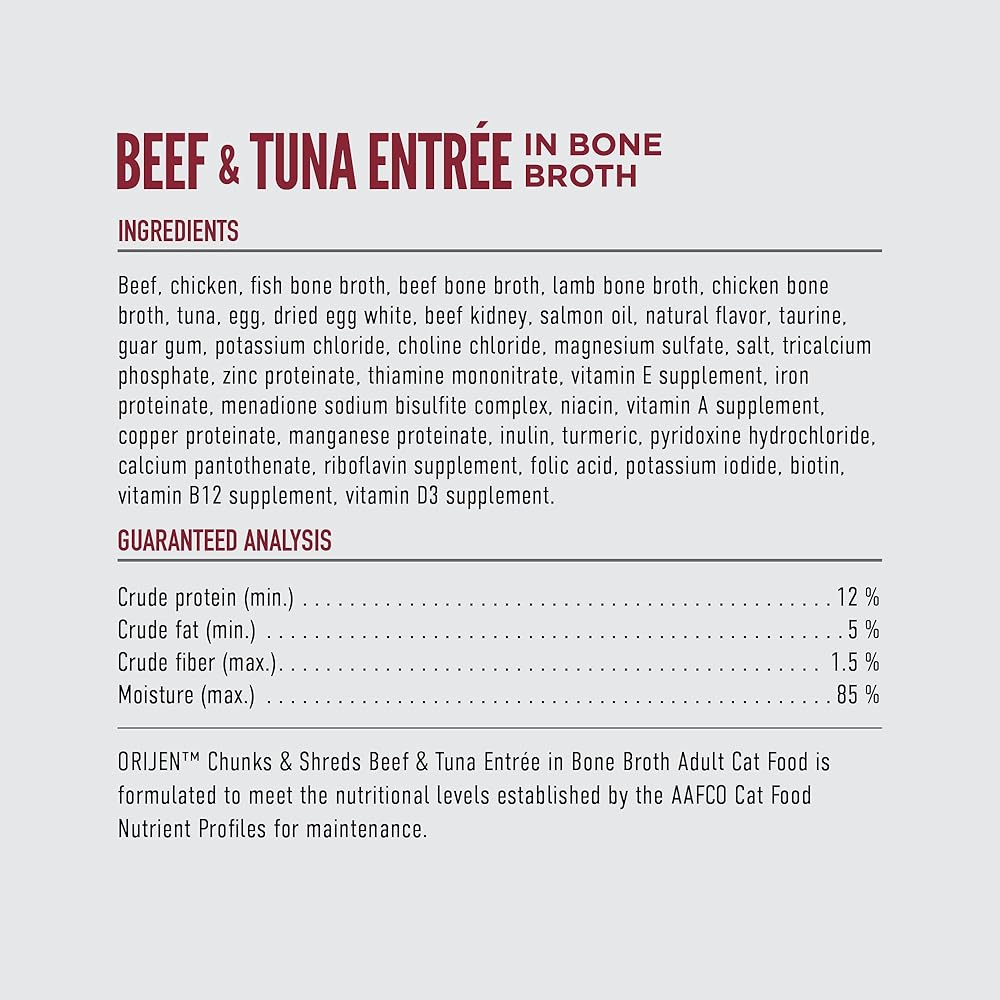 Nourish your cat completely with hearty WholePrey animal ingredients and real shreds of meat, poultry or fish in ORIJEN™ Chunks & Shreds Wet Cat Food! Cats are obligate carnivores, so they thrive off a diet packed with animal ingredients. That's why our Duck & Liver Entrée wet cat food recipe includes a whopping 95% animal ingredients* to provide your cat with the Biologically Appropriate nourishment they were born to eat. This ORIJEN diet also includes succulent WholePrey ingredients like chicken liver to provide your cat with rich and varied nutrients. Bone broth helps support your cat's hydration, while also adding tempting flavor to this premium cat food. Nourish your cat with the texture and variety of raw animal ingredients packed into every can of ORIJEN™ Chunks & Shreds wet cat food. *Exclusive of water. **Produced in a facility that also processes grains. Our included raw ingredients are delivered frozen.