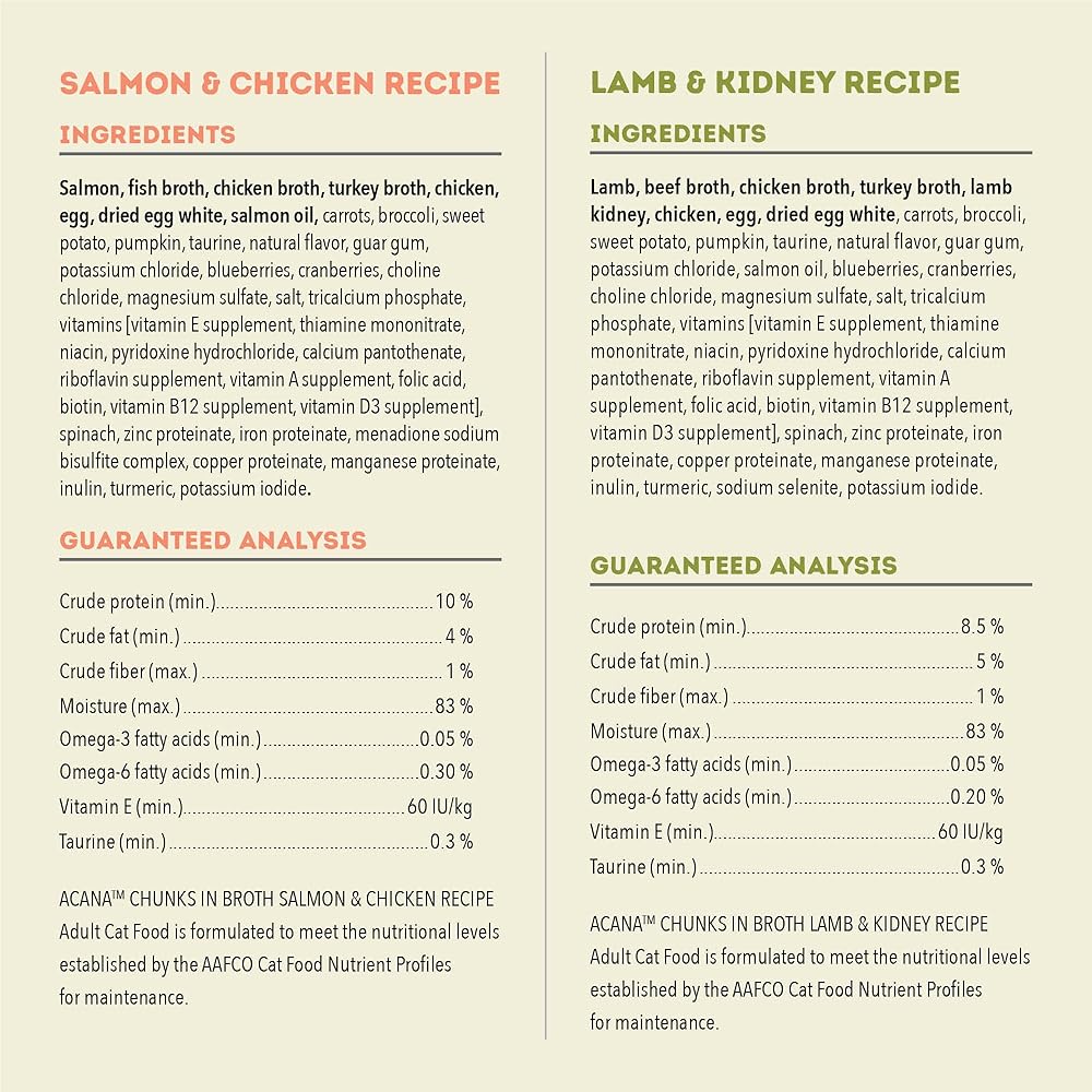 Nurture your cat with the protein-rich animal ingredients and delicious bone broth in ACANA™ Chunks in Broth wet cat food! Crafted with 85% animal ingredients*, our Lamb & Kidney Recipe cat food provides your pet with the nourishing animal protein they crave. Each can features nourishing high-protein animal ingredients, including savory lamb and kidney, in satisfying chunks. It also includes hydrating beef, chicken and turkey broths to tantalize your cat's tastebuds and provide them with the moisture they need. This premium cat food also helps support your cat's immune health and skin & coat health. Nurture your cat with an ACANA wet cat food that helps them feel so good inside, you'll see it on the outside! *Exclusive of water; approximate value. **Produced in a facility that also processes grains.