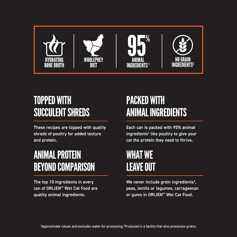 Nourish your cat completely with hearty WholePrey animal ingredients and real shreds of meat, poultry or fish in ORIJEN™ Chunks & Shreds Wet Cat Food! Cats are obligate carnivores, so they thrive off a diet packed with animal ingredients. That's why our Original Entrée wet cat food recipe includes a whopping 95% animal ingredients*, including chicken and salmon, to provide your cat with the Biologically Appropriate nourishment they were born to eat. This ORIJEN diet also includes succulent WholePrey ingredients like chicken liver to provide your cat with rich and varied nutrients. Bone broth helps support your cat's hydration, while also adding tempting flavor to this premium cat food. Nourish your cat with the texture and variety of raw animal ingredients packed into every can of ORIJEN™ Chunks & Shreds wet cat food. *Exclusive of water. **Produced in a facility that also processes grains. Our included raw ingredients are delivered frozen.