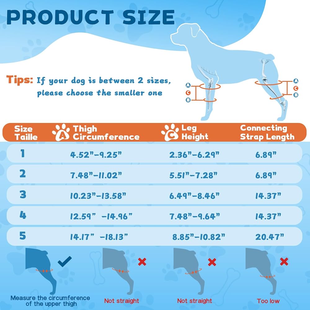 【KNEE SUPPORT COMFORTBALE】The dog brace Provides great compression to support your dog's knee caps, joints, and muscles to ensure optimal protection. The stabilizers of these dog knee brace for luxating patella help to reduce pain and discomfort caused by ACL injuries, provide safe and comfortable support for dogs with hip dysplasia, and improve mobility.