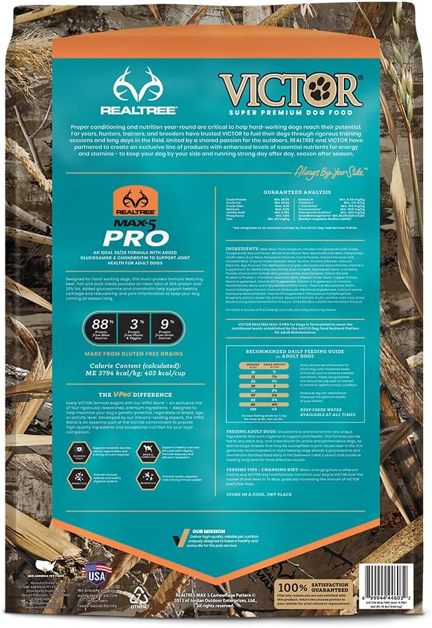 REALTREE MAX-5 PRO: This super premium, high protein dog food is ideal for active adult dogs. This dry dog food contains high-quality beef, fish and duck meals, with added glucosamine and chondroitin to promote healthy cartilage and support hip and joint health. This sporting dog food is formulated to support your active dog's high energy demands. This professional adult dog food is a dry kibble with 30% protein, 20% fat, and is 3794 KCAL/KG or 403 KCAL/CUP. The protein in this dog food comes from premium meat sources (88%), plants and veggies (3%), and gluten free grain sources (9%). Realtree and VICTOR have partnered to create an exclusive line of super premium dog food products, formulated with adult working and hunting dogs in mind, featuring enhanced levels of essential nutrients for energy and stamina - keeping your dog running strong all season long. Every VICTOR dog kibble formula is created with our proven VPRO Blend of ingredients, designed by industry-leading experts to support superior digestibility, strong immune system function, and healthy skin and coat for every dog, regardless of breed, age, or activity level. And the result is visible: healthy, happy pets who are ready for the next adventure.