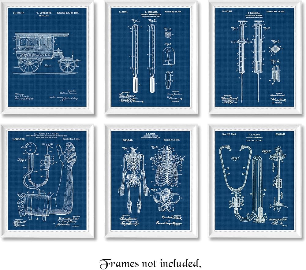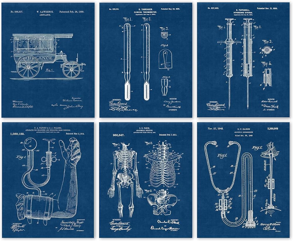 DESIGNED AND MADE IN USA. The set of 6 vintage blueprint posters prints is bound to impress and rival collectibles of fan, club or history buff. Make healthcare art for office, nurse desk accessories, medical lab decor.