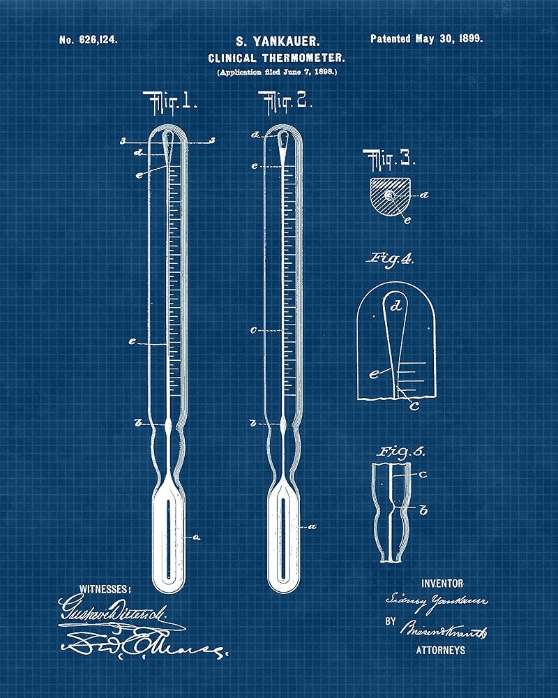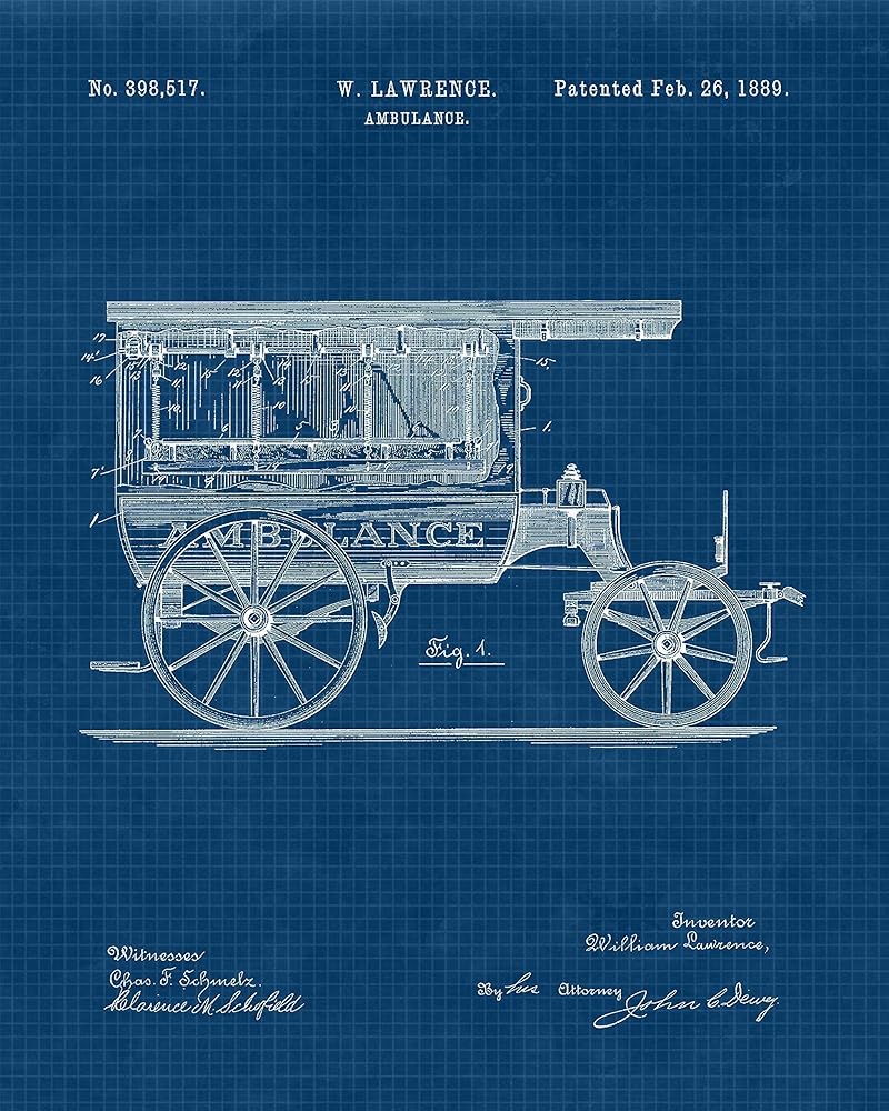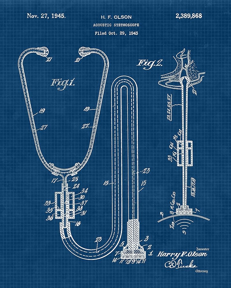 Unframed vintage set of iconic medical patents artwork (not on canvas/metal/wood) reinterpreted to capture the spirit of innovation, modern medicine, and hand crafted to infuse the classic, vintage feel and personal touch by our award winning artist in North Carolina. Includes Stethoscope and Blood Pressure Cuff set, Thermometer, Ambulance, skeleton.