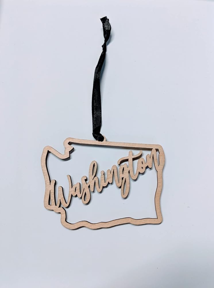 Washington Christmas Ornament. A modern twist on the typical state shape! Ornament your tree this year to achieve a rustic Christmas look. Made from laser cut wood and black ribbon, Measures 4"l x 3" h x 0.25-inch depth.