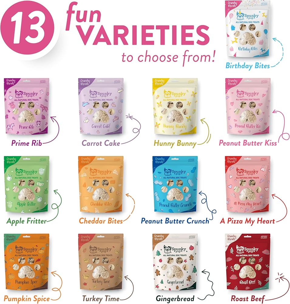 Perfect for everyday snacking. Spunky Pup's Birthday Bites Crunchy Biscuit Treats are the all-natural crunchy treats your dog will love! Handmade in the USA in small batches, our Biscuit Treats are perfect for training or for rewarding your dog. Made with real, healthy ingredients, we use no artificial flavors, colors, or preservatives. Check out our range of Everyday treats or our holiday-themed flavors. Available in a 10 oz resealable stand-up pouch.