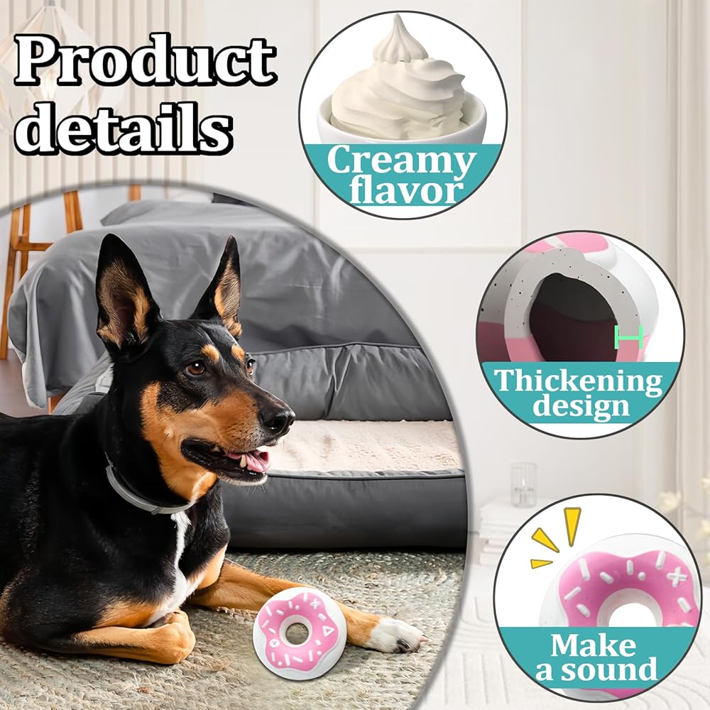 【Realistic Donut Shape and Tempting Creamy Flavor】The dog chew toy has realistic donut shape. The cute doughnut shape attracts pets and lets your pet play more happily. A creamy flavor is more appealing to dogs and can stimulate their nibbling and chewing nature.