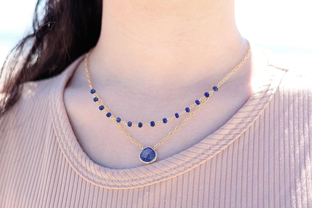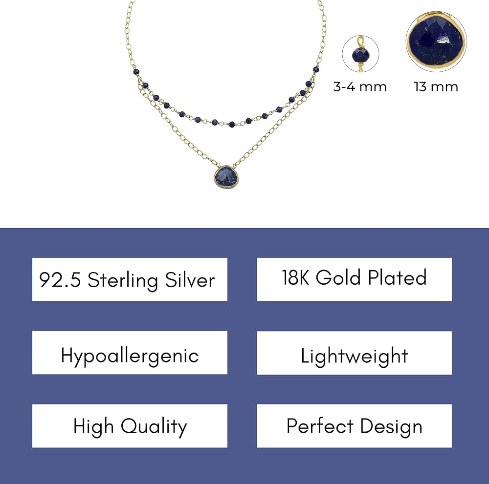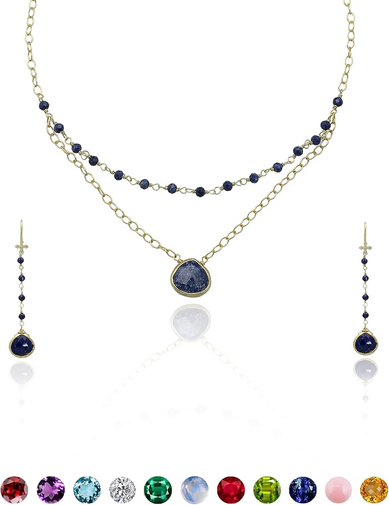 FEATURES - Heart-shaped layered blue sapphire birthstone earrings necklace set handmade with natural blue sapphire gemstones and 18k real gold plated sterling silver natural zircon earwires. Nickel free, lead free, no harm to skin. - Comes beautifully packed in AbshelNY black gift box, ready for gifting.