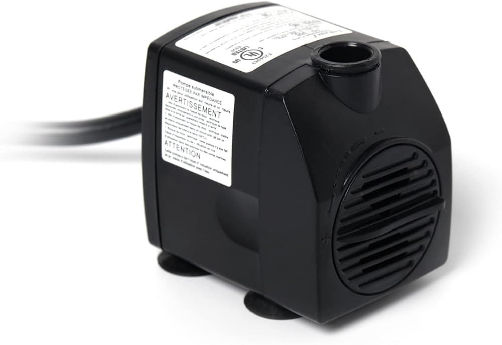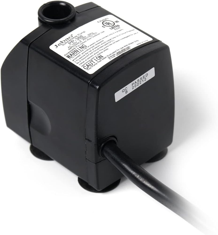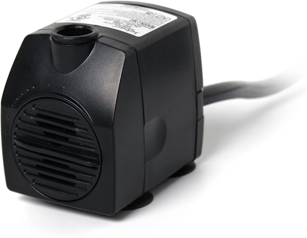 Quiet, energy-efficient magnetic drive pumps at a great price. Versatile, high-performance pumps boast power and low energy use - ideal for pond fountains and waterfalls. Use completely submerged only. Washable pre-filter included. Model: 388 Dimension: 2.7" x 2.0" x 2.5 Output Adapter: 1/2" AC Power 120V 60Hz Watt: 12 Watt Cord Length: 6 Feet Max gph: 198gph Max Head: 4.9 Feet PERFORMANCE: A) 185 GPH @ 0.7 FT B) 161 GPH @ 1.3 FT C) 132 GPH @ 2.0 FT D) 134 GPH @ 3.3 FT E) 63 GPH @ 4.6 FT F) 0 GPH @ 4.9 FT