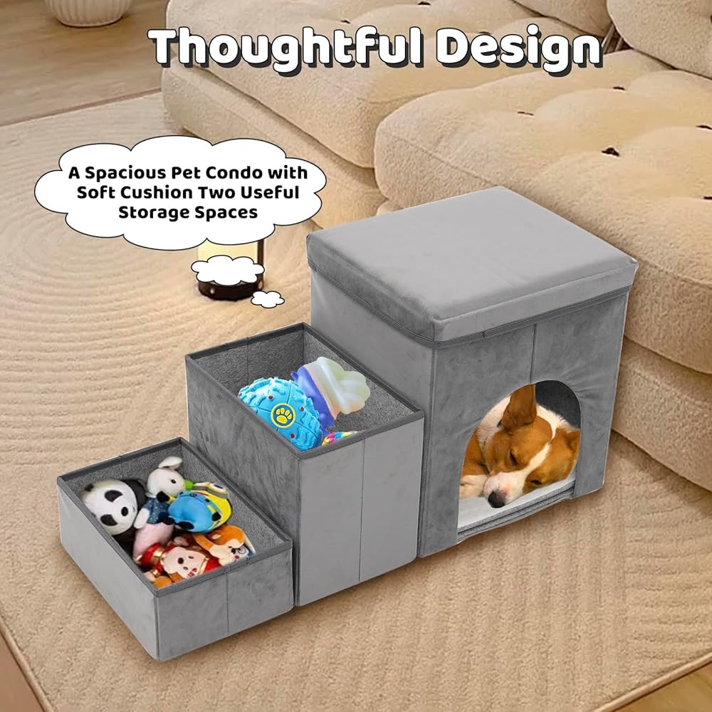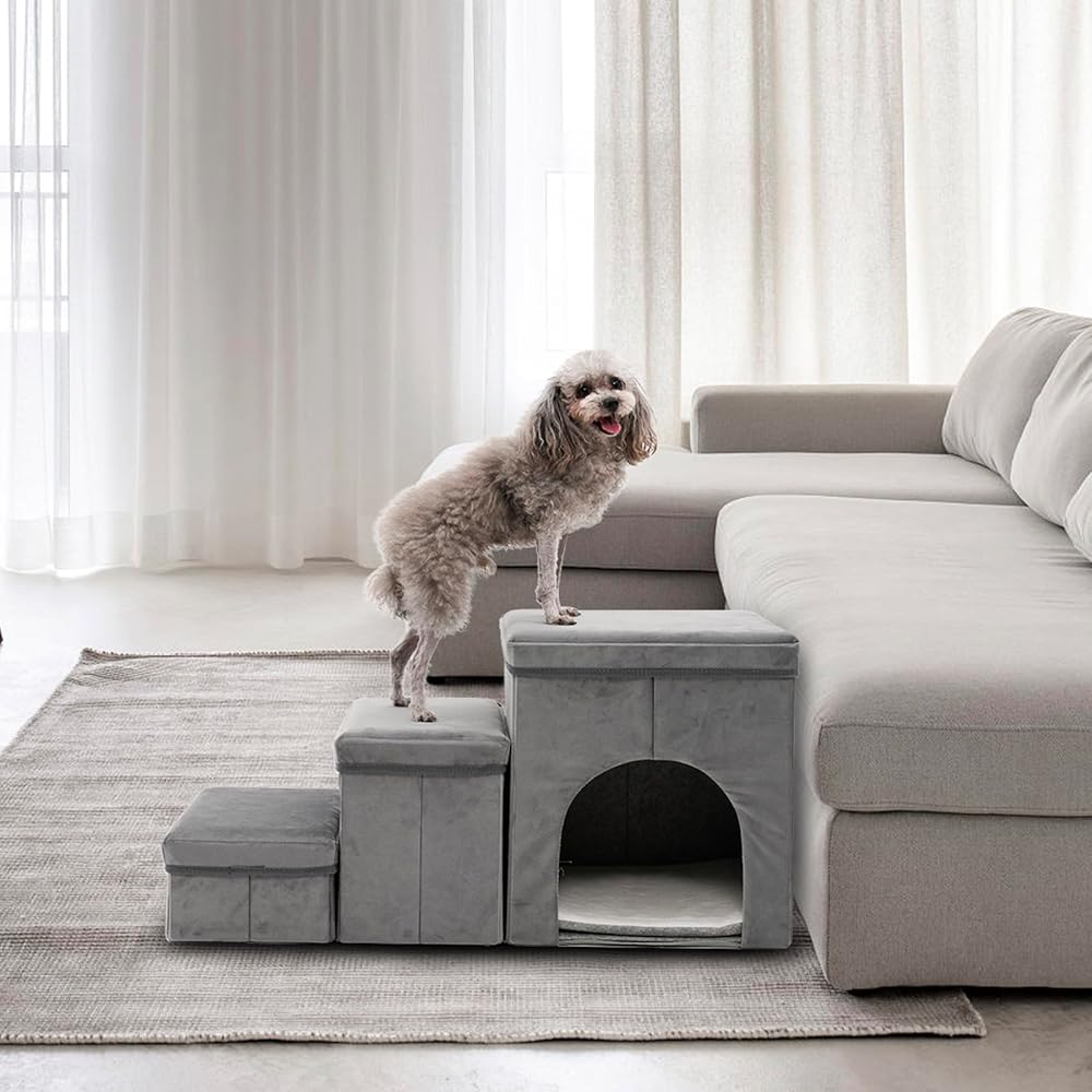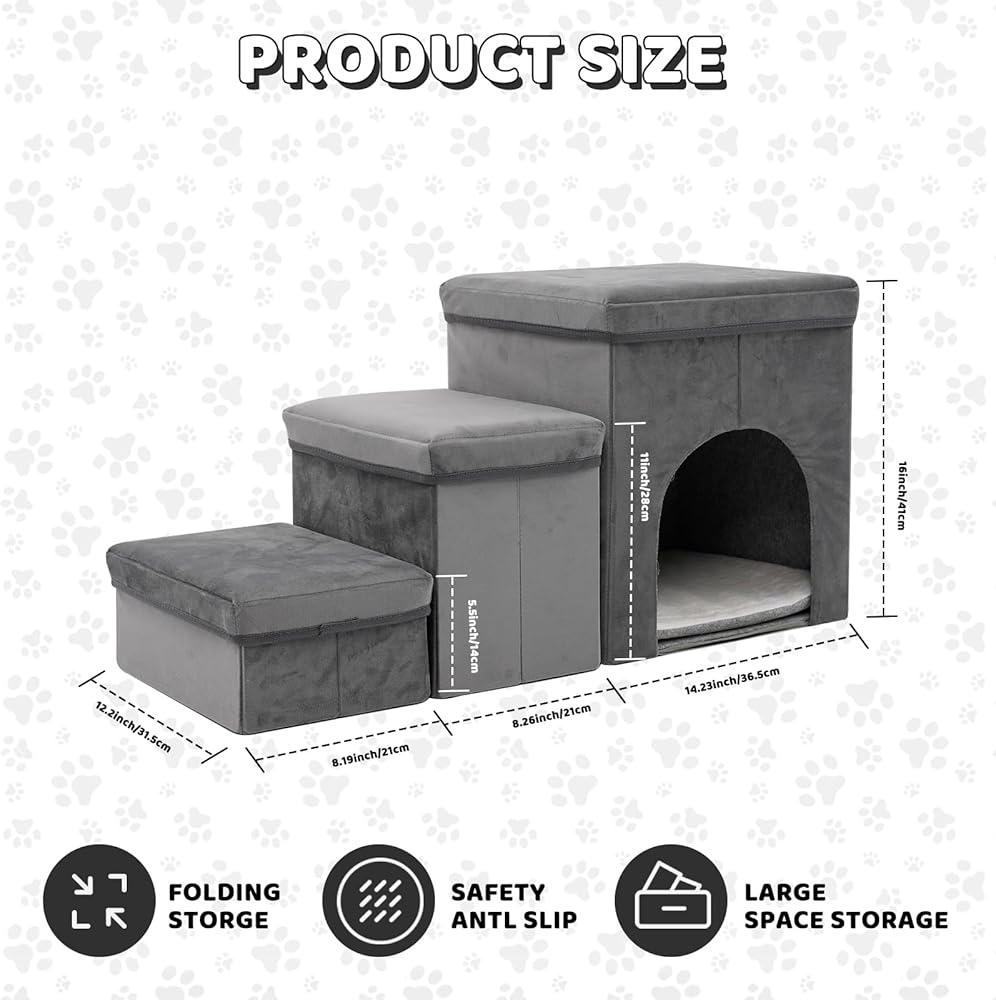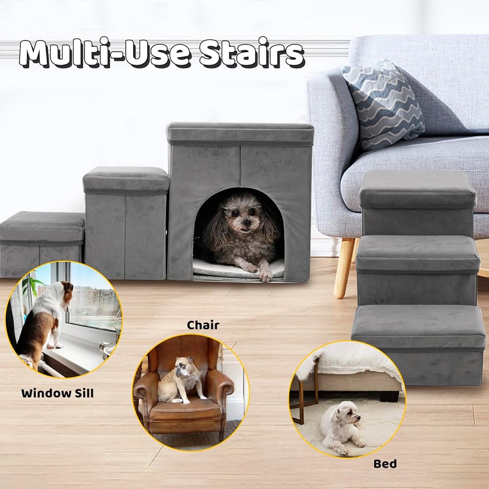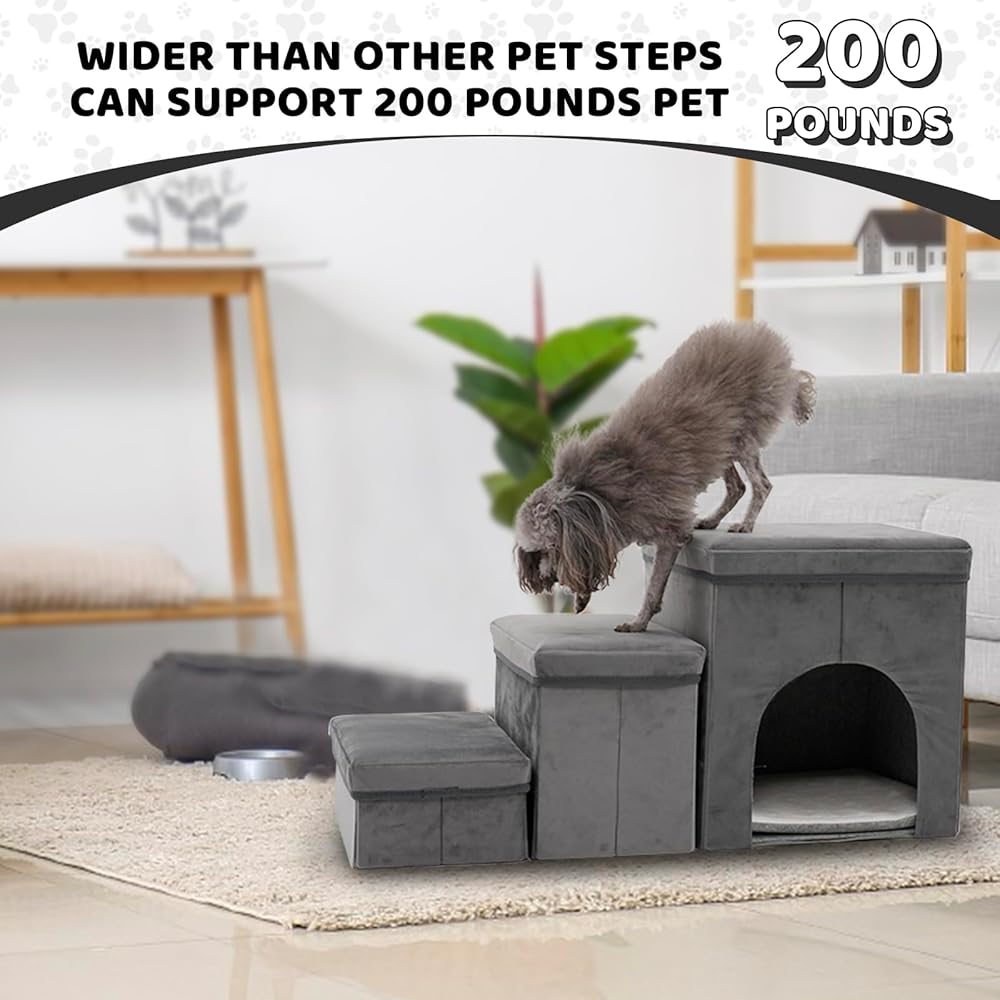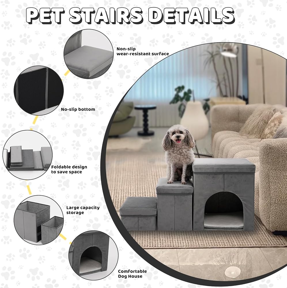 Dog Stairs for Small Dogs and Cats Foldable Pet Steps for High Bed and Couch Portable Ramp Stairs for Couch 3-Step Pet Stairs with Storage and Pet House for Small Dogs and Cats or Pets Joints