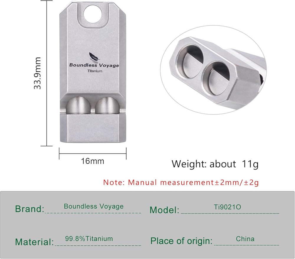 【Size】Ti9021O: (H)3.39cm*(L)1.6cm (whistle). Weight: about 11g. Made of high quality Titanium. The waterproof, anti-corrosion material enable the whistle more durable and resistant to various complex environments. With a short black rope, it can be tied to the zipper of a backpack or clothes, which is very portable.