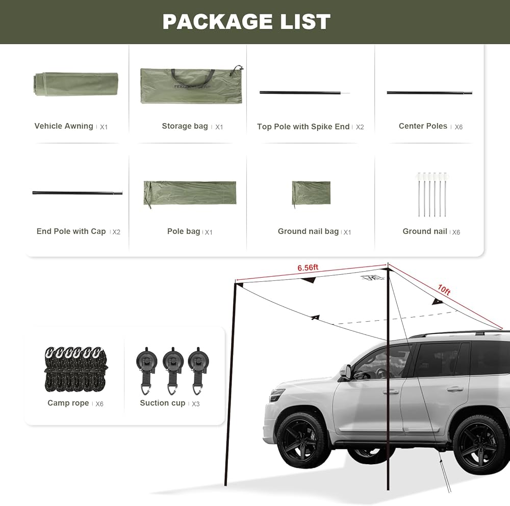 【PACKAGE CONTAINS】 1x Vehicle Awning; 1x Storage bag; 2x Support rod assembly ①; 4x Support rod assembly ②; 2x Support rod assembly ③; 1x Pole bag; 1x Ground nail bag; 6x Ground nail; 6x Wind ropes with a length of 3m; 2x Suction cup. If you have any questions, please do not hesitate to contact us.