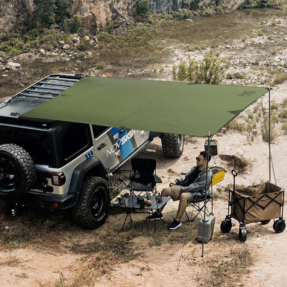【WATERPROOF & SUNPROOF PROTECTION】The camping awning made from 210D polyester ripstop silver-coated fabric,which provides PU 5000mm Waterproof & UV 50+ Sun Protection for you. Make you feel safe and sheltered in all weather conditions. A storage bag will be provided for you to organize the truck canopy. As well as pole bag and ground nail bag.