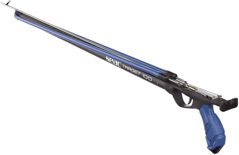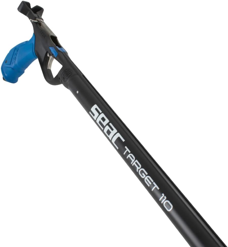 The SEAC TARGET is a speargun looking for excellent performance and reliability. The TARGET series has an aluminium barrel with a diameter of 28 mm and an open muzzle for two circular sling, with integrated rod guide. The ergonomic rubber grip guarantees comfort and high performance for the freediver, who can use it with both hands. The entire steel mechanism guarantees reliability over time and the exclusive assembly system of the entire firing block makes any disassembly or customisation operations simple and easy to perform. SEAC TARGET is sold with a 16 mm Power Blue elastic, with articulated nosepiece, 6.25 mm stainless steel Tahitian rod. Optional reel.