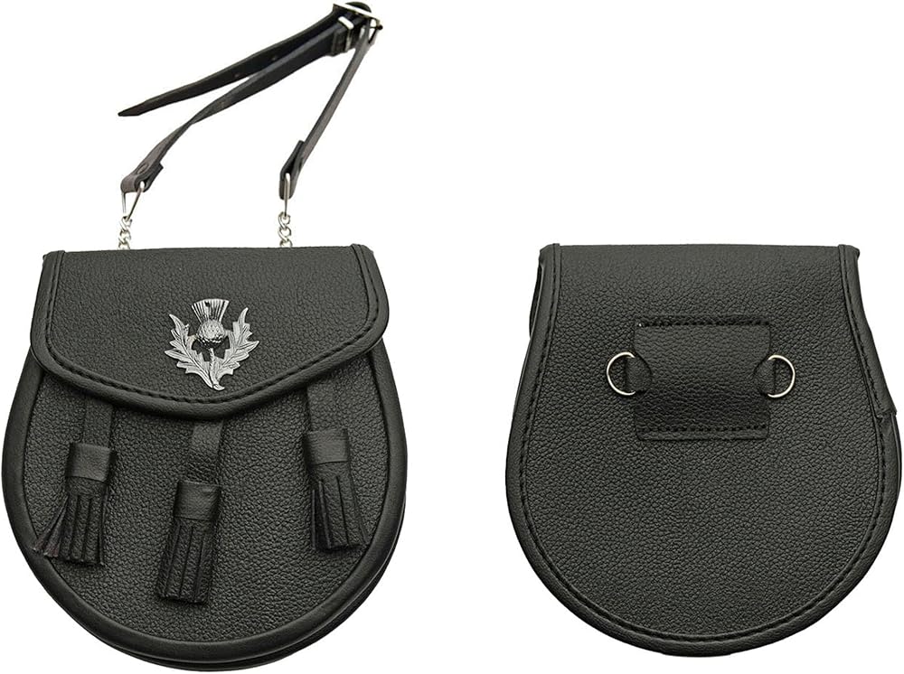 This Leather Scottish Sporran by Szco Supplies is 8 Inch in overall length. The sporran, flap and tassels are made of black leather. The belt is made of chain and leather.