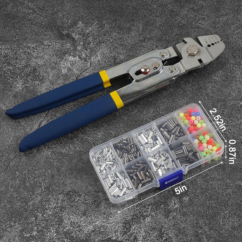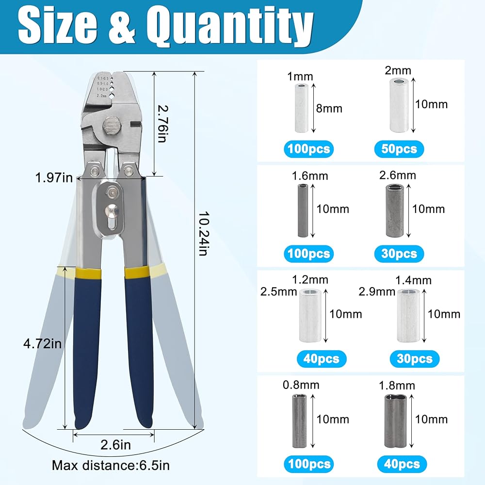 【Applications】This fishing crimping tool set include crimping pliers and 590pcs 8 sizes aluminum copper crimp sleeves kit. It is perfect for making fishing leaders, rigging lures, wire rope, cable line, boat rigging, dog leashes and etc.