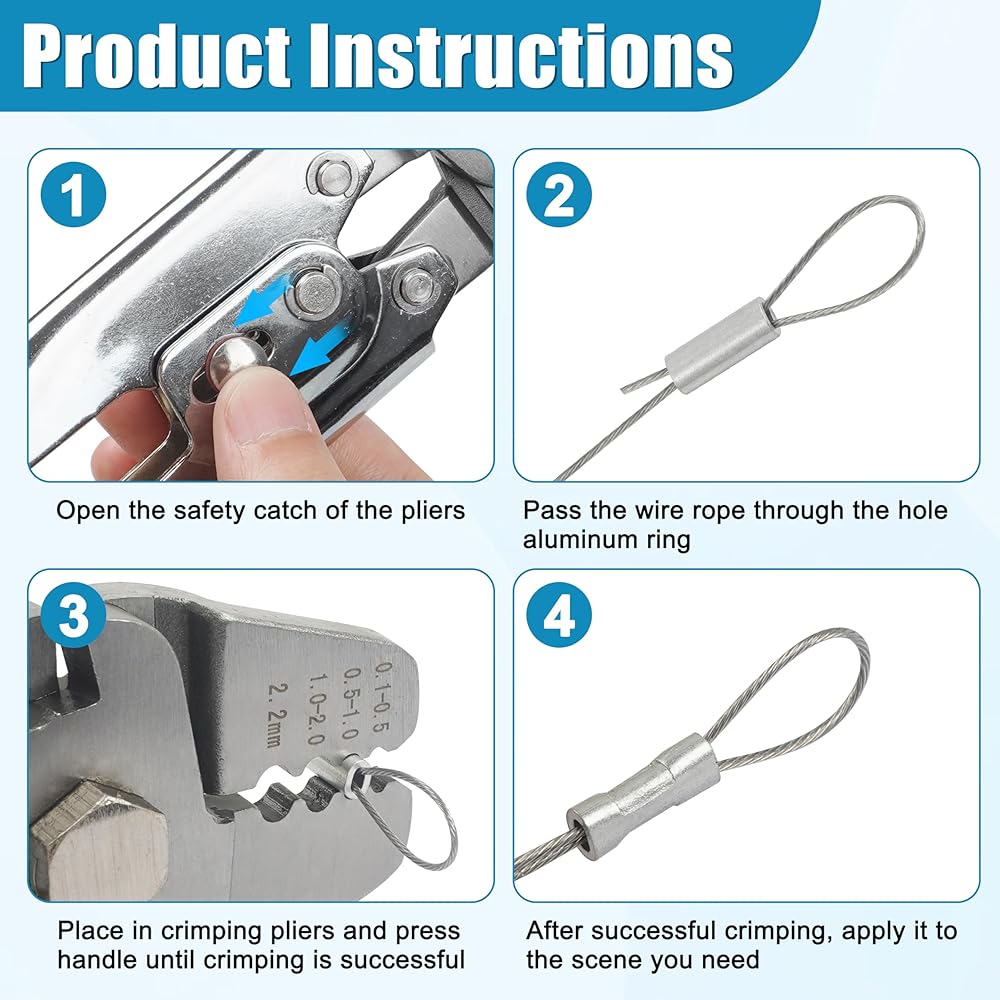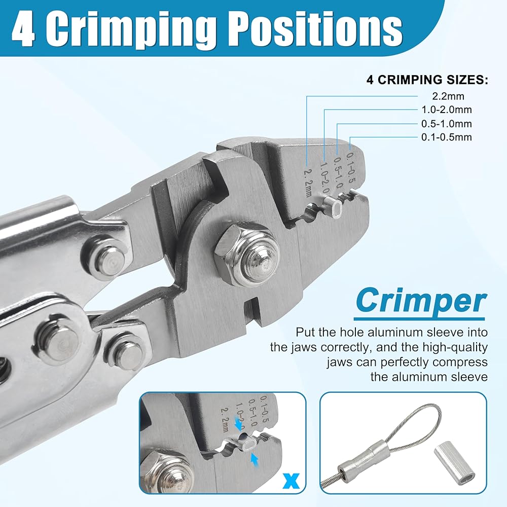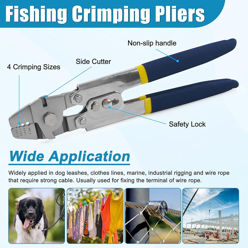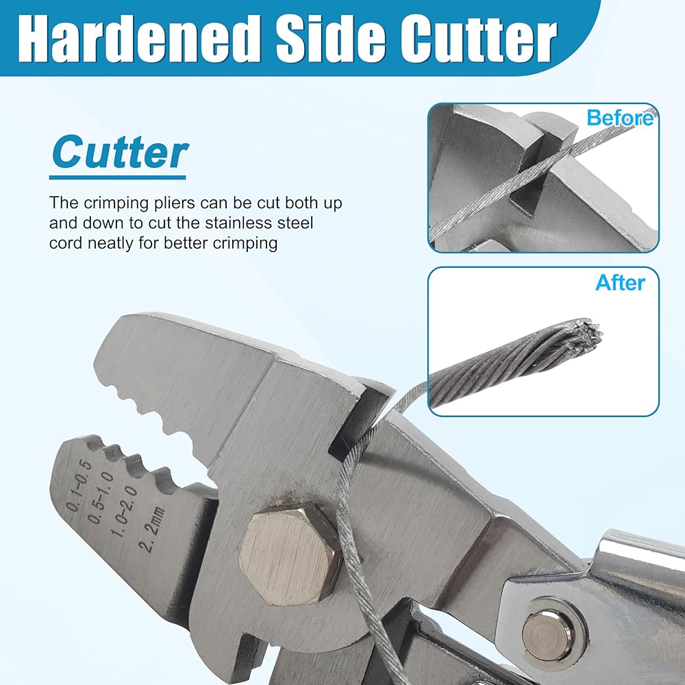 【Fishing Crimping Pliers】Fishing crimping pliers serve as a 2-in-1 tool, It include 4 crimping positions 0.1-0.5mm, 0.5-1mm, 1.0-2.0mm, 2.2mm,and Wire Rope Crimper Plier Jaws come with two side cutters to cut steel cable precisely.