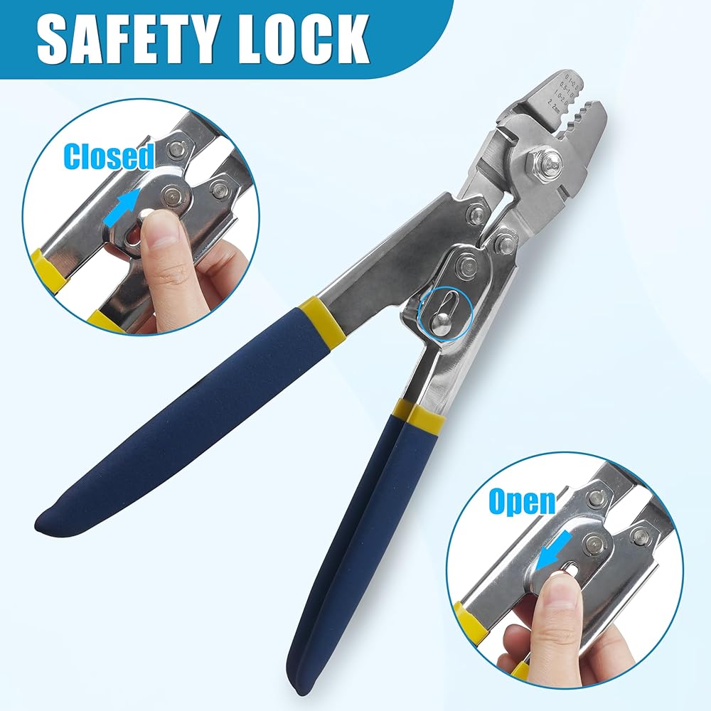 【Ergonomic Design】Fishing line crimping tool with cushioned non-slip grips and self locking mechanism design,which makes it more relax to provide optimum pressure,and the safety lock is easy way to keep you crimper close,providing a more convenient operating experience.