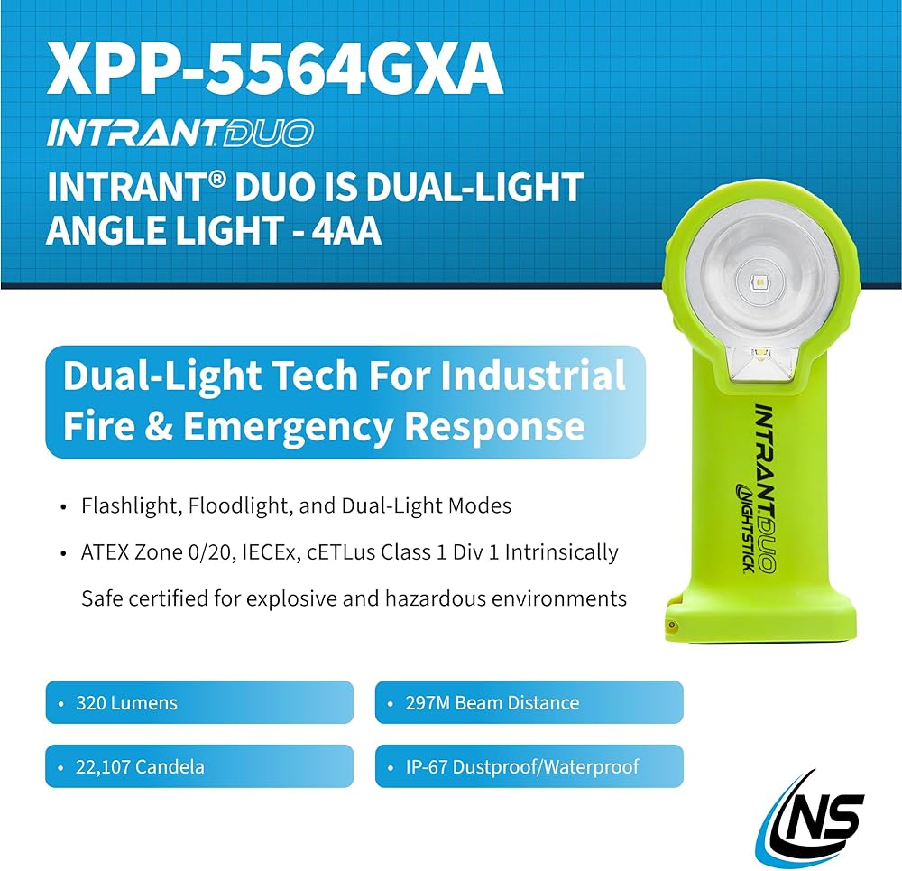 The INTRANT DUO TURBO Intrinsically Safe Angle Light is equipped as a flashlight, floodlight, and Dual-Light engineered for the brutal, challenging nature of fire and rescue. ATEX ZONE 0/20, cETLus, and IECEx certified Intrinsically Safe, the INTRANT DUO is geared for the fight in hazardous scenarios. In spotlight mode the INTRANT DUO offers user-selectable brightness settings of 250 and 110 lumens with a 469-meter beam distance. With a bolstered 54,900 candela at your arsenal, the spotlight's tight beam pierces through smoke and haze with ultra-clarity at long distances. The floodlight mode has user-selectable brightness settings of 270 and 120 lumens. A battery status indicator glows green at full battery and shows red when battery is low. Dual-Light mode on the INTRANT DUO combines the long-range visibility of the flashlight with the wide-area illumination of the floodlight, enabling users to discern objects in the distance while maintaining orientation. The floodlight's 45° downward tilt is meticulously designed to mitigate the risk of slips and falls, ensuring that both light sources work in tandem to navigate through treacherous environments safely. Powered by 4 AA batteries (included). Rated IP-67 Dustproof/Waterproof. Meets the requirements of NFPA-1971-8.6 (2013).