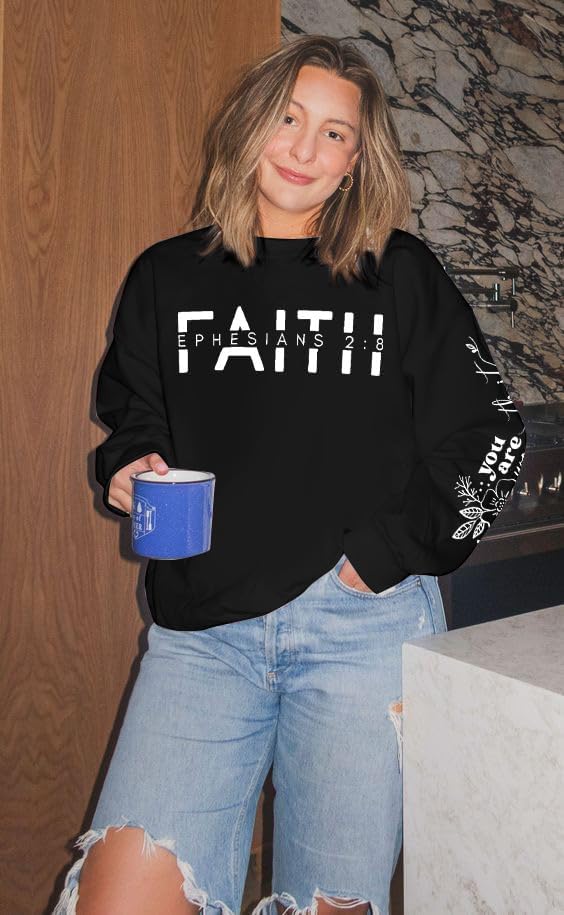 Feature: Elegant christian faith sweatshirt, Christian inspirational graphic pullover sweatshirts, letter print long sleeve round neck pullover shirt sweatshirts, Christian shirt top pullover, faith sweatshirts, crew neck sweatshirt.