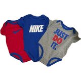 The Nike Bodysuit 3-Pack includes a variety of short-sleeve one-pieces with assorted graphics designed for casual, everyday wear.