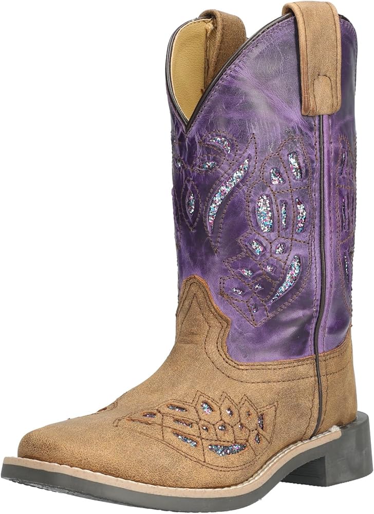 Smoky Mountain Childs Trixie Purple Boots The Smoky Mountain line of boots is the result of them listening to their consumers needs and answering them with a targeted product. Smoky Mountain provides a product that is quality crafted, fashionable, durable and most of all affordable. The Trixie Boots are definitely going to make you stand out. The "cut outs" on the shaft and upper make the colors pop. Features: Cushion padded insole Steel shank Cotton lined foot Quality leather Double row welt stitch Item Specifications: Color: Brown Distress/Purple Heel: Block Heel Height: 1.25" Shaft Height: 8.25" Material: Leather Sole: Rubber Toe: Square