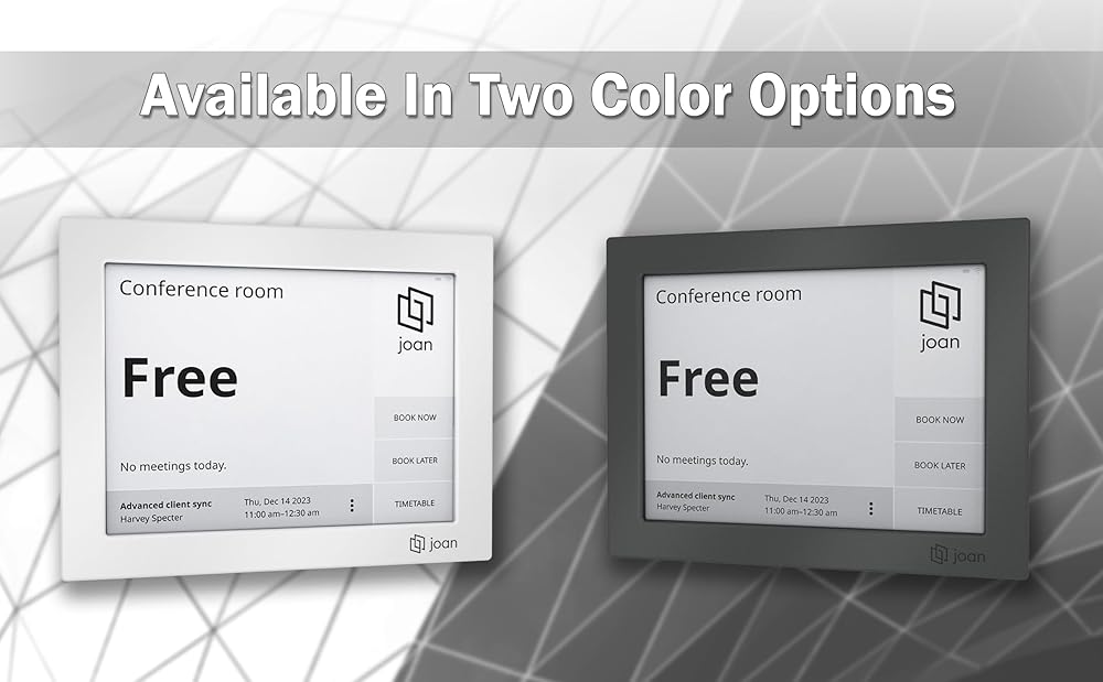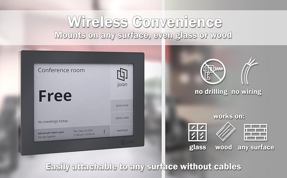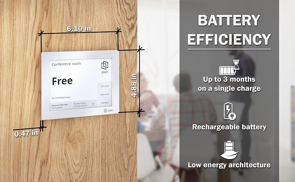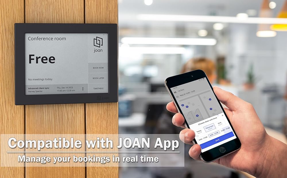 EFFORTLESS MEETING MANAGEMENT: Joan 6 RE simplifies the booking of meeting rooms through its E-paper touchscreen display, offering real-time calendar sync (Workspace, Exchange, Office 365, and iCalendar), for seamless room availability updates. You can also reserve rooms through Joan's mobile app for uninterrupted meetings. Choose between the three subscription options that best suits your meeting needs.