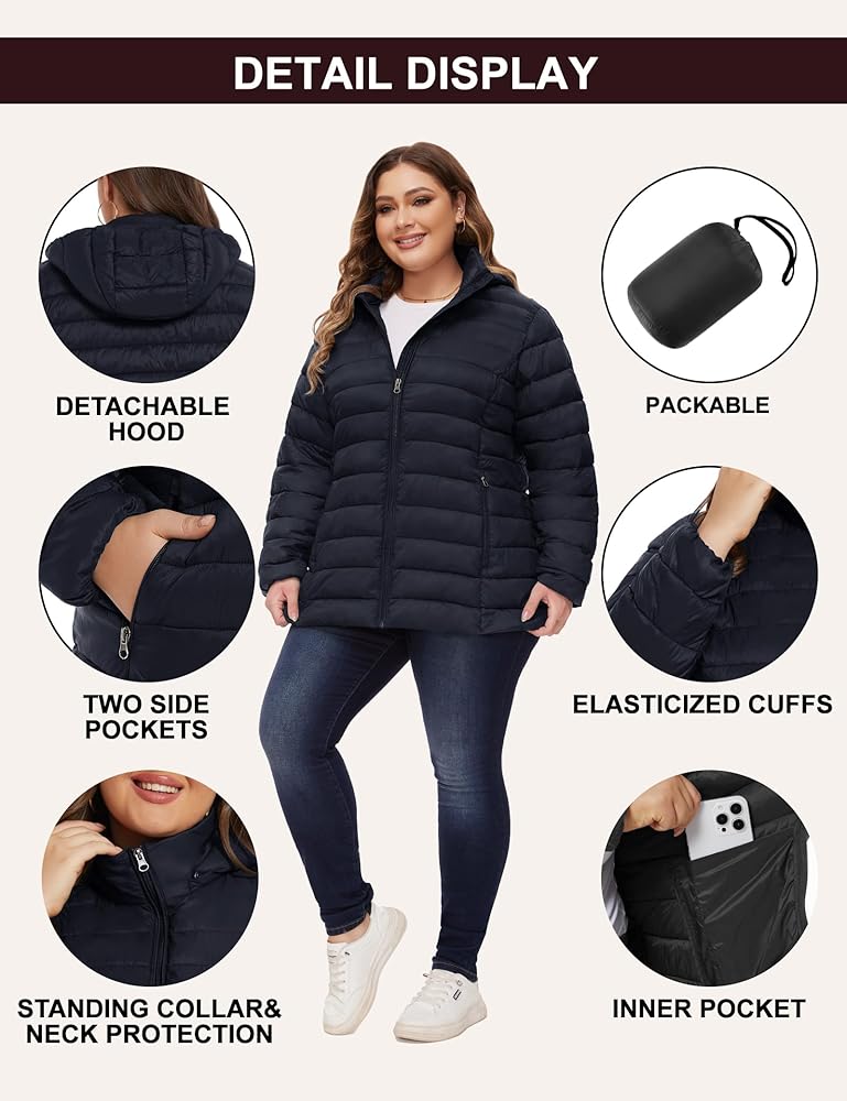 This hip-length puffer jacket, meticulously crafted with a focus on catering to the plus-size demographic. We invite you to consult our size chart for precise fitting, and our team is readily available to address any sizing inquiries you may have.