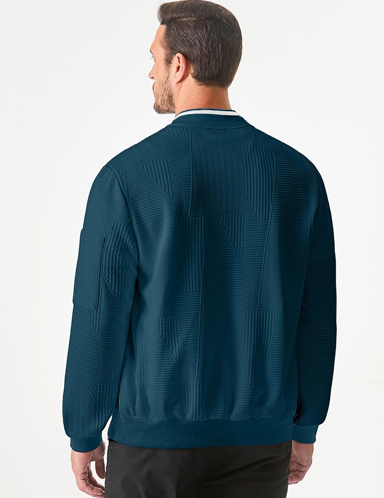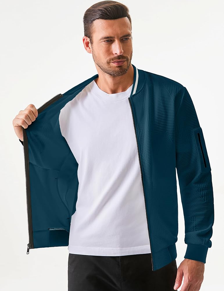 Stylish Design: This men's bomber jacket features a modern, sleek design with a subtle geometric pattern, making it perfect for both casual and semi-formal occasions. The contrasting black cuffs and hem add a touch of sophistication to the overall look.