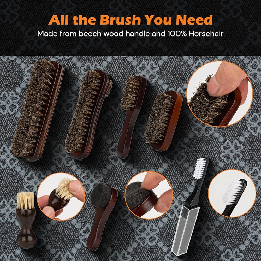 SHOE SHINING KIT(16PC): Comes with 3 tins of black, brown,and neutral shoe cream polish(2.65oz),5 different sizes of horsehair brushes,3 shoe polish applicator brushes,applicator sponges brushes, Plastic brush, gloves,3 buffing cloth and beautiful classical gift box.