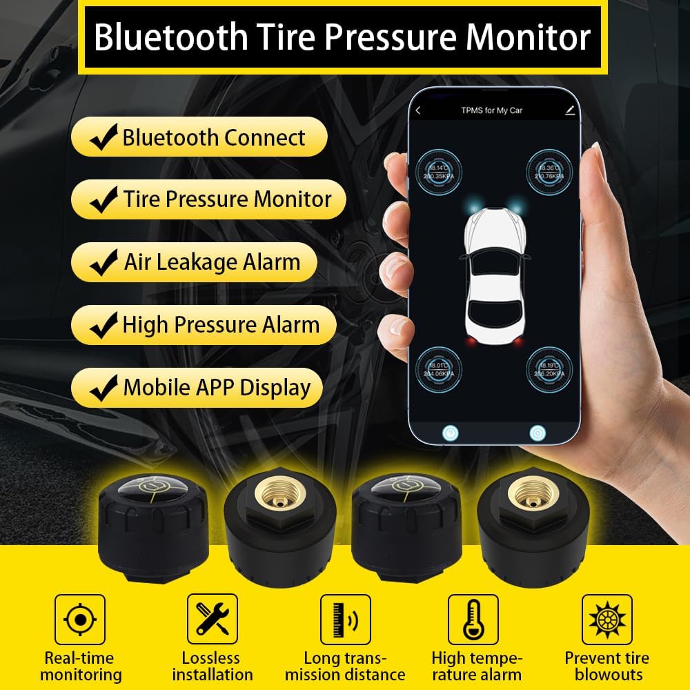 ☮️ Peace Of Mind: Ideal tire pressure is vital for safe braking and road grip. The Bluetooth TPMS tire pressure monitor system tracks pressure in real-time, detects leaks, and sends alarms for any tire issues. Its smart algorithm warns when limits are exceeded, ensuring safety and peak vehicle performance.