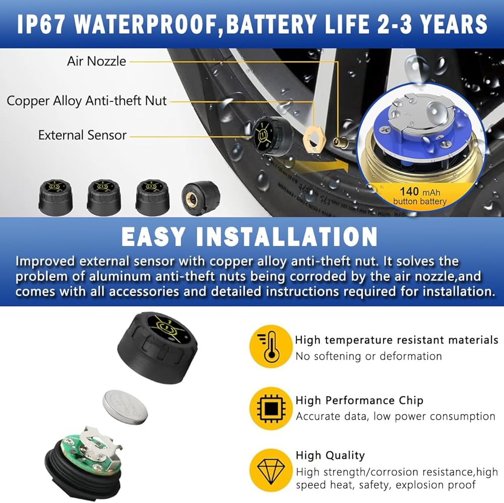 🔧 Easy To Install & Use: Simply attach these TPMS sensors to the air fill connector on your tires, download the app, follow the instructions, and no tools needed. Connects to Bluetooth-enabled smartphones for live tire pressure monitoring systems (TPMS), eliminating the need to crawl on the ground to check tire pressure. Supports Android and iOS systems.