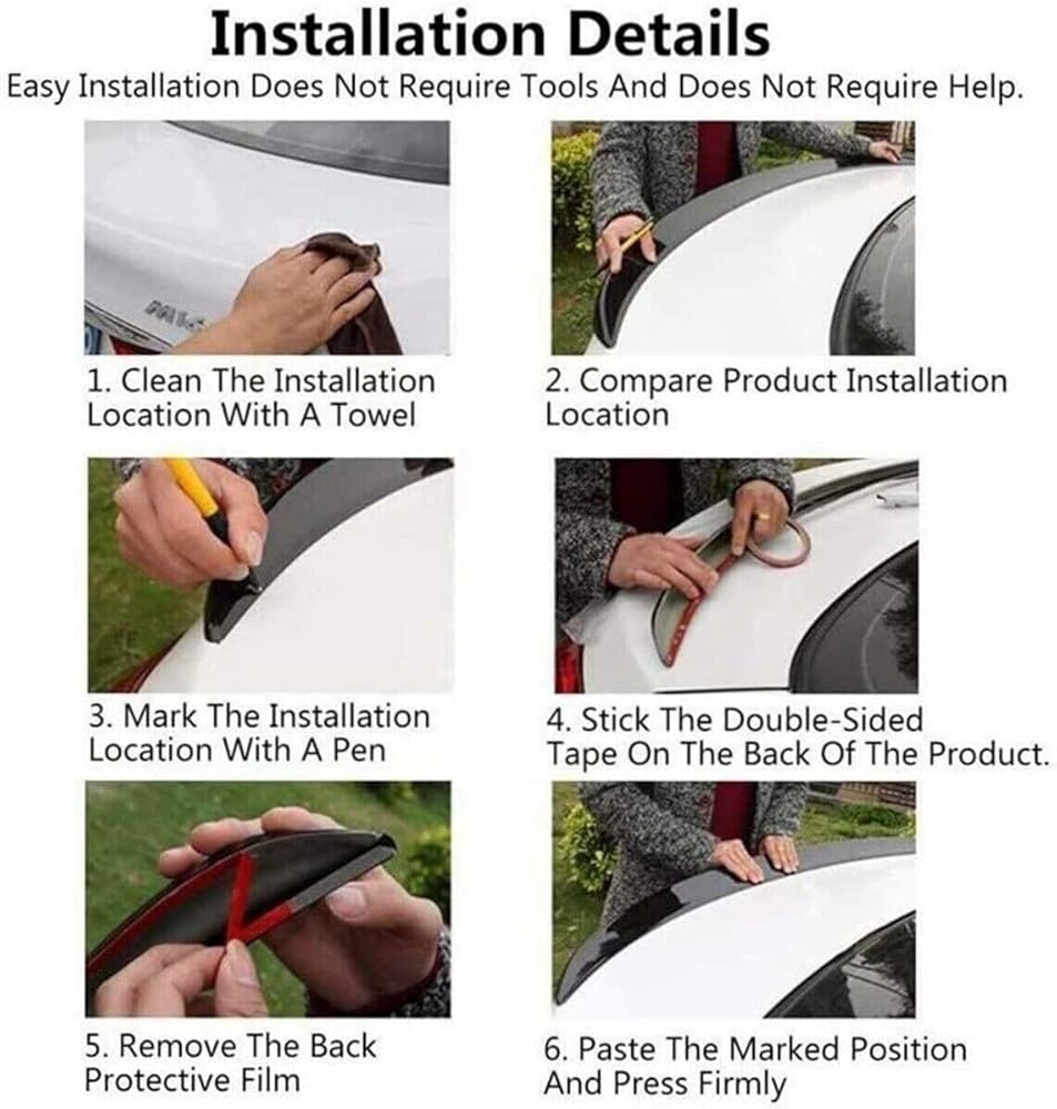 Easy Installation - The rear spoiler is easy to install without any special tools. No drilling or cutting required. Self-adhesive tape is attached on the back, and heating the double-sided tape with a hair dryer will further improve the bonding effect.
