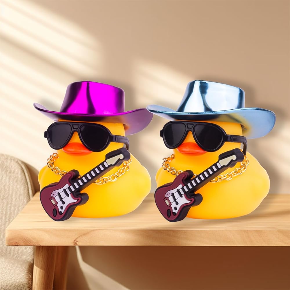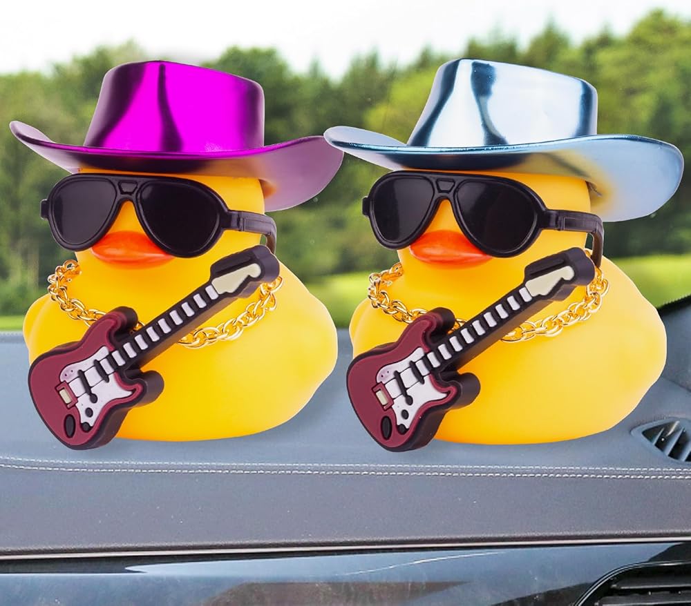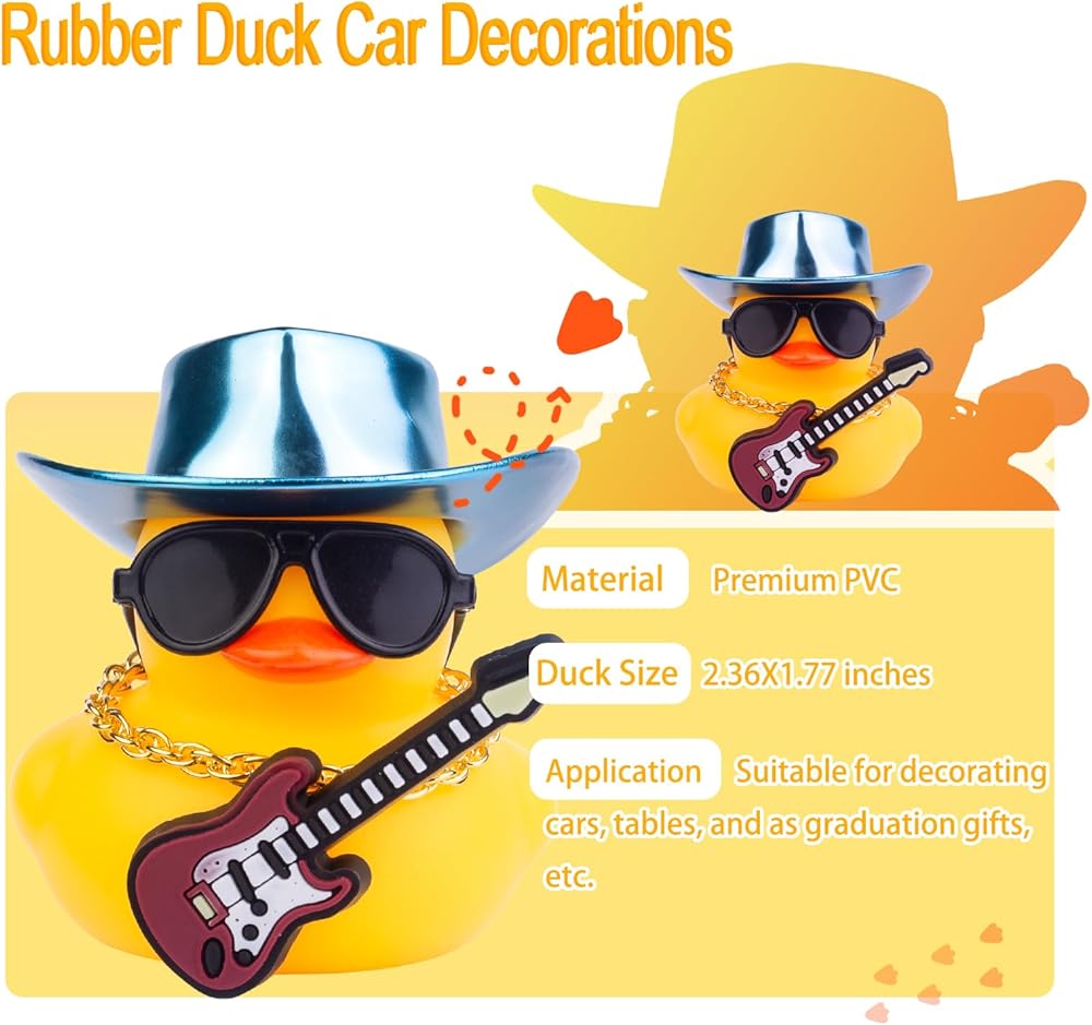 🦆 Dashboard Decoration: The rubber duck for the dashboard has mini cowboy hat, sunglasses, necklace, and mini musical instrument. This car dashboard rubber duck can decorate your car very well, add some fun, and relieve fatigue during the driving trip of a car.