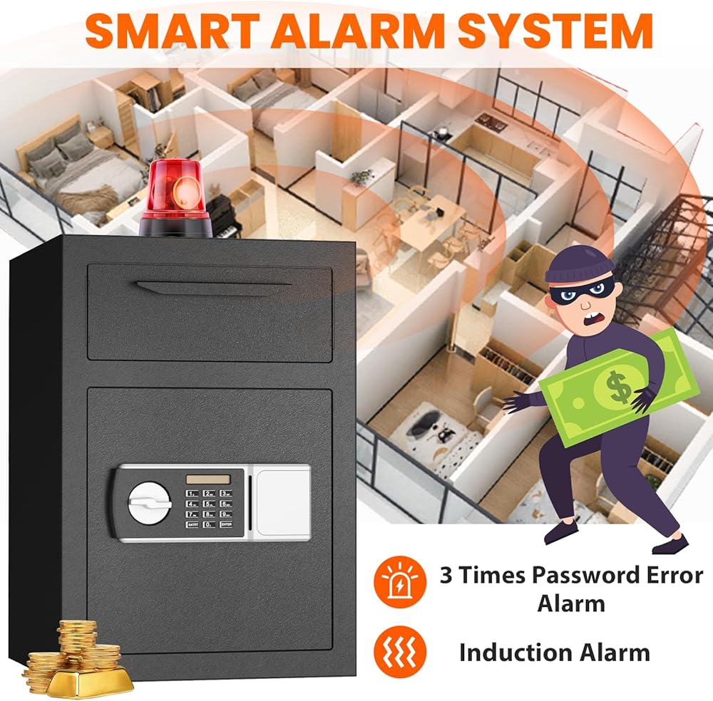 【Dual Anti-Theft Alarm System】An alarm sounds after three incorrect password attempts or if the safety box experiences vibrations or impacts. Entering the correct code stops the alarm.