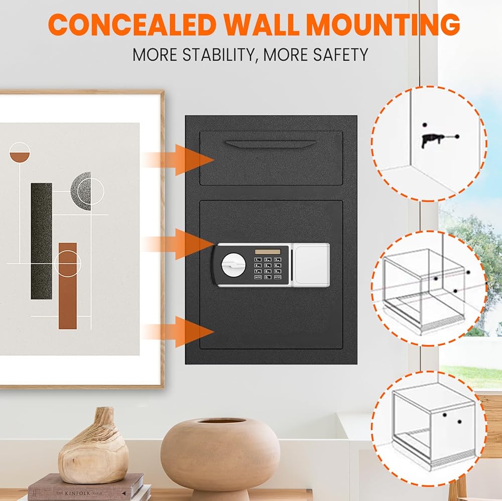 【With Deposit Slot & Adjustable Shelf】The cabinet safe includes a 9 x 7 inch fireproof and waterproof document bag. The top compartment has a front slot for easy deposit of cash or coins without opening the door. The bottom compartment features adjustable and removable shelf, allowing you to customize the internal layout to suit your storage needs.