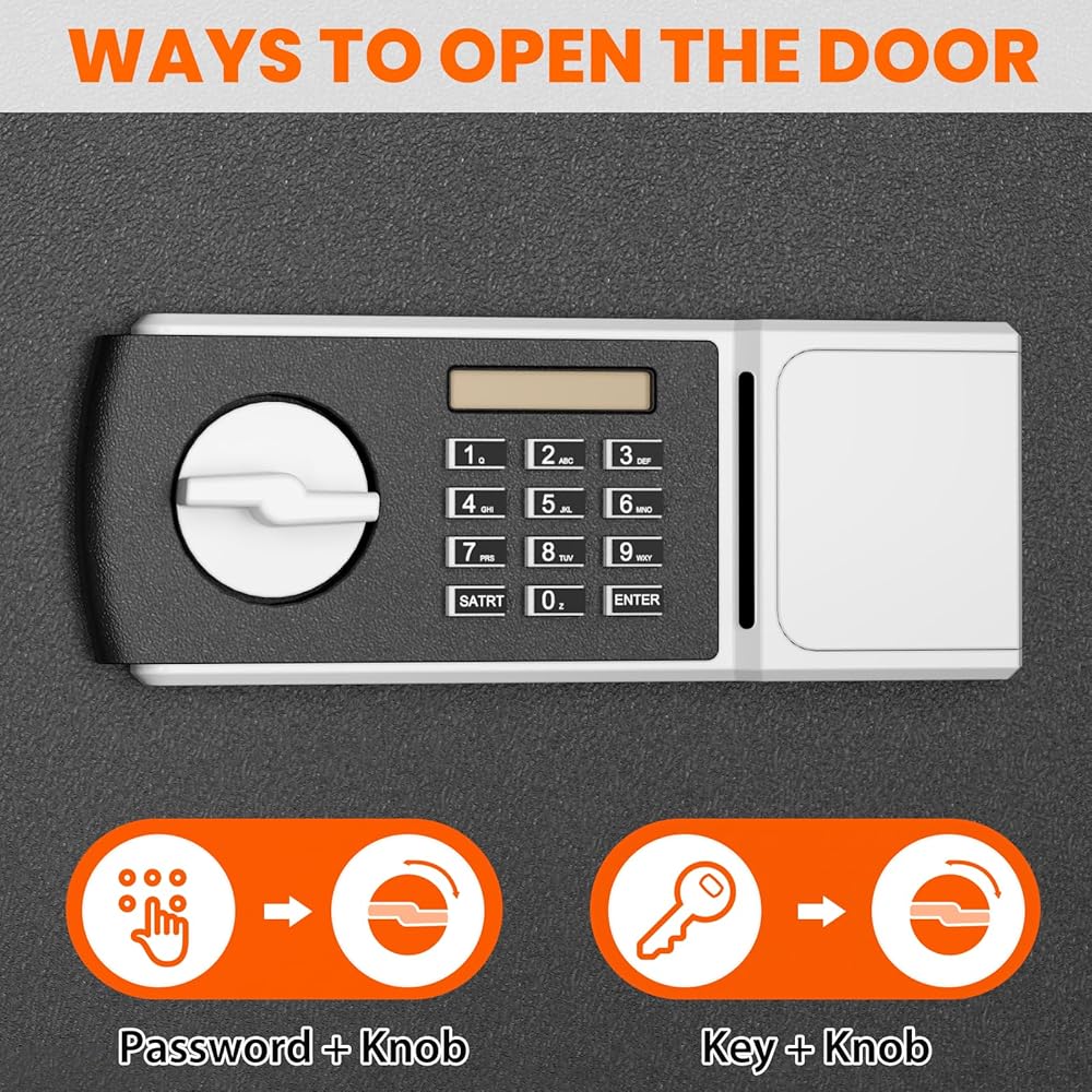 【Extra Large Dual Door Safe】The large safe measures 13.8 x 13.8 x 29.5 inches and features an upgraded dual-door design for separate access. The upper compartment's internal dimensions are 13.4 x 12.2 x 9.64 inches, while the lower compartment's internal dimensions are 13.4 x 12.2 x 19.3 inches. Its sleek black exterior with gold interior accents makes it ideal for home and office use.