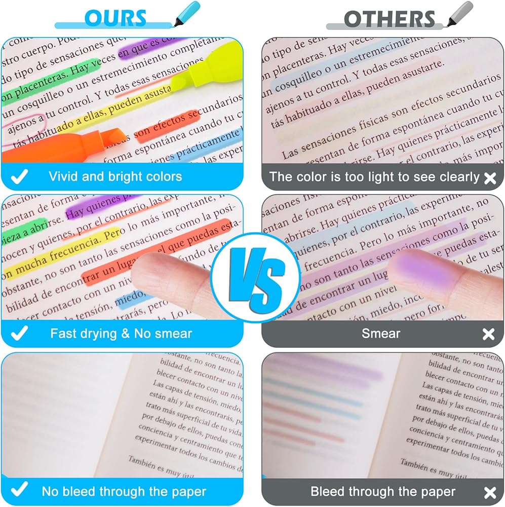 Non Bleed & Quick-Drying Highlighter - Highlighter pens use quick-drying ink, making highlighted marks clearly visible without worrying about the ink staining your hands and your book. Even if you highlight on one side of the page, the other side is still completely readable, and there's no need to worry about ink bleeding through and affecting the readability of the page.
