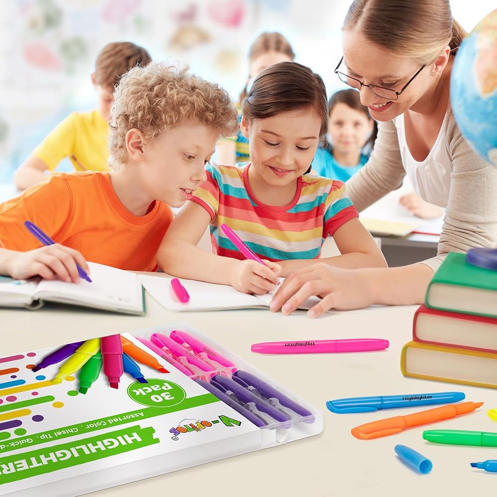 Value Highlighters Pack - Highlighter set includes 30 bright highlighters in 6 colors. There are 5 of each color(yellow, pink, blue, green, orange, and purple) . With many colors of highlighters to choose from, you can easily color code notes and study materials to make your notes look clear and organized.