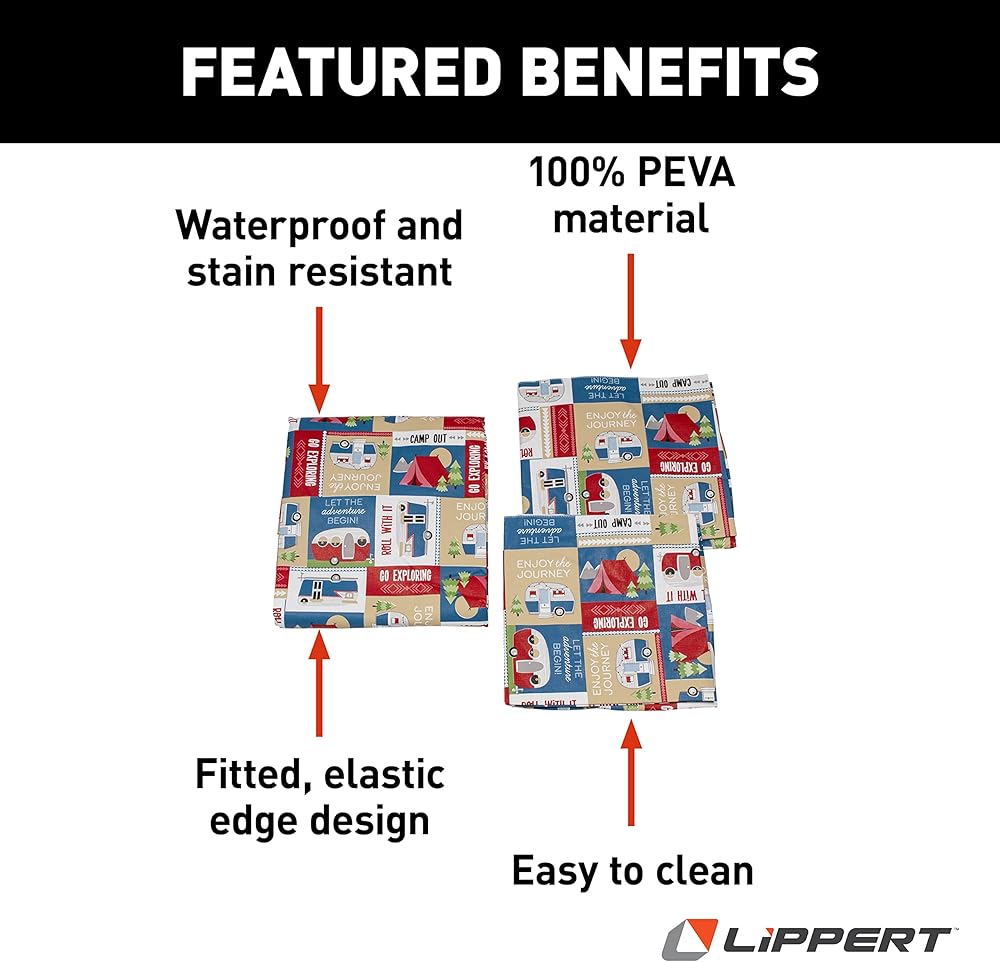INNOVATIVE DESIGN — With a fitted, elastic edge design, Lippert vinyl table and bench covers won't blow away in the wind. You can keep them secure no matter the weather conditions