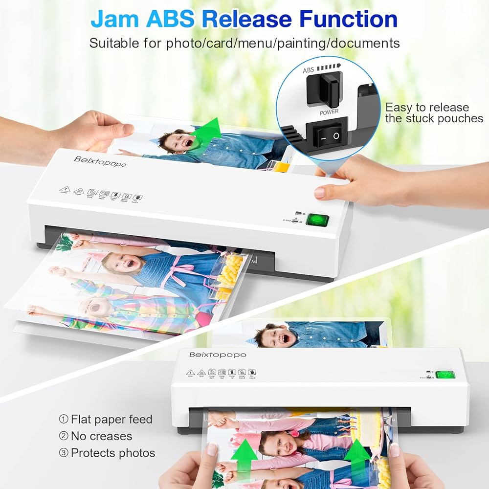【No Jam Worry Paper In And Out Freely】Advanced Anti-Jam Tech, once you are laminating in an incorrect way, turn off the machine and press the ABS button, then pull out the paper. The ABS button keeps your documents and photos away from wrinkles or curls. Note: If you are using the lamination pouch that comes with our laminator, please select "HOT" mode and laminating after preheating.