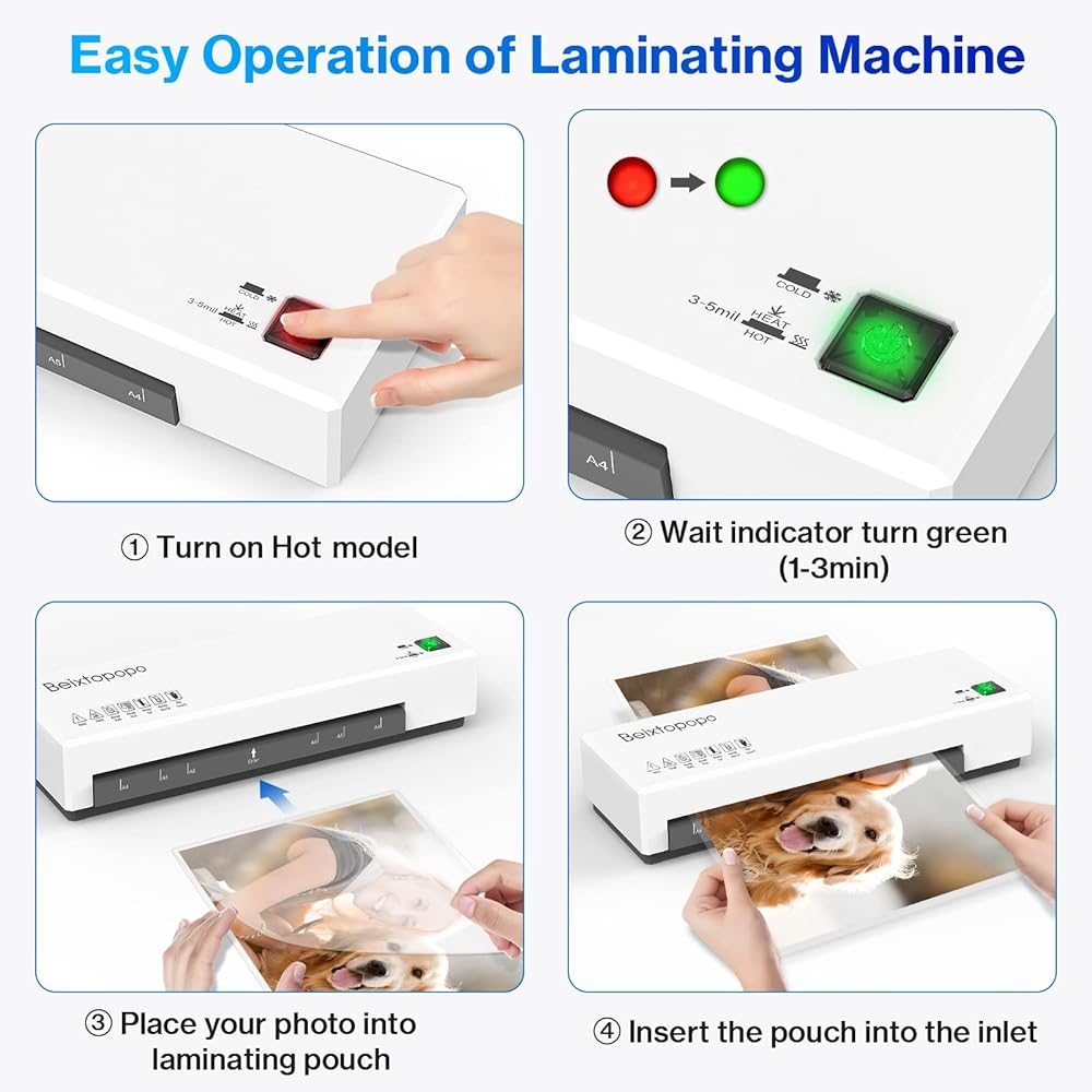 【Versatile 5 in 1 Laminator for All Files】A4 Laminator comes with 20 sheets of laminated pouch(5 sheets of A4, 5 sheets of A5, 10 sheets of A6), 3 photo rings, 1 paper trimmer, 1 corner rounder, 1 hole punch. One Purchase Satisfy All Your Needs. Laminate your favorite pictures to create unique photo albums; save school certificates and awards; perfect for laminating picture cards and flashcards for teachers.