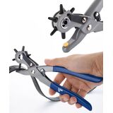 • Convenient, practical, and effective! Just unlock the handle, rotate the wheel to select hole size, align leather subject and squeeze handles.